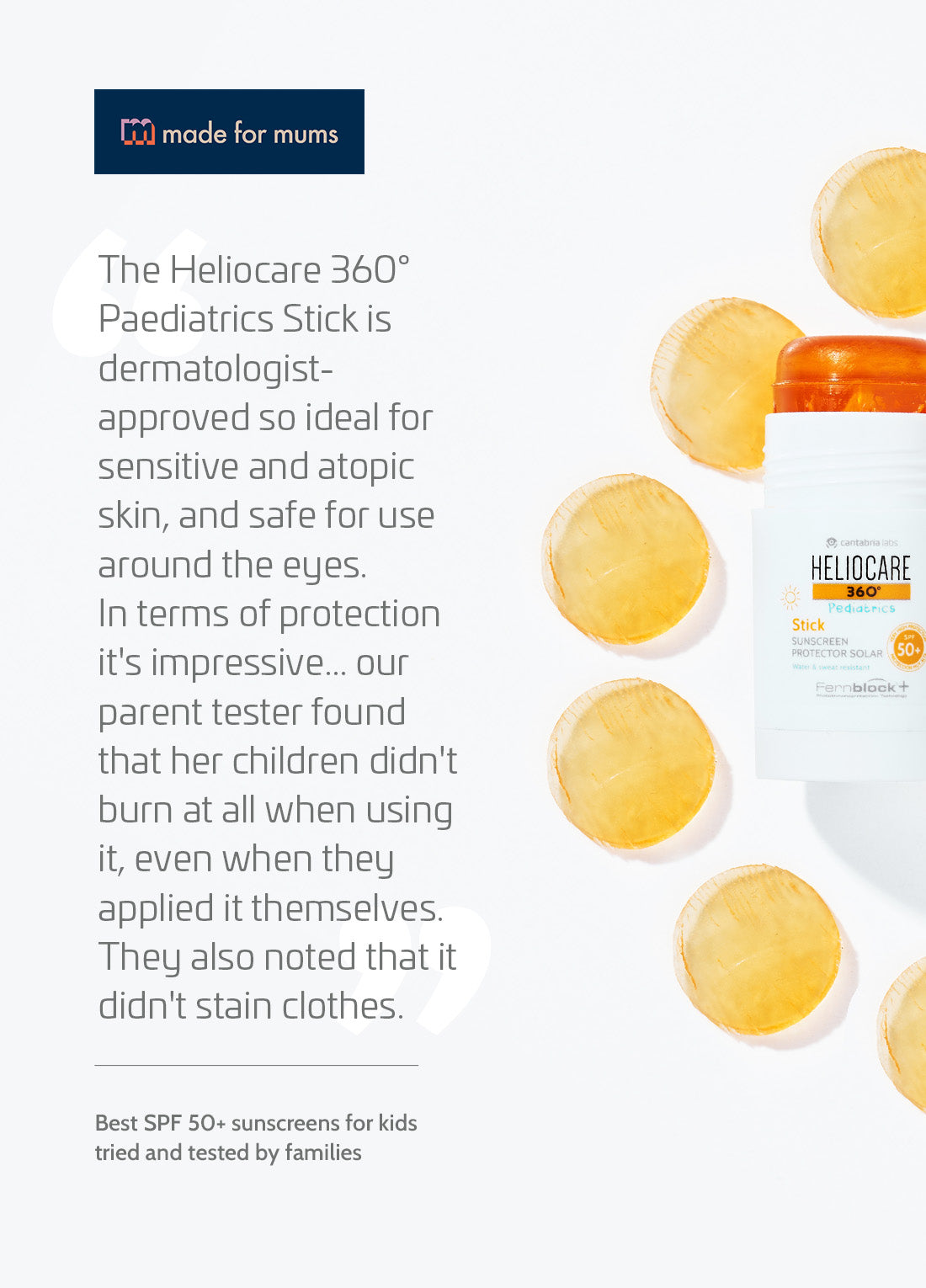 HELIOCARE 360° Pediatrics Stick SPF50+ is a facial sunscreen stick developed for children aged 2 years and older. It delivers full-spectrum protection against UVB and UVA (SPF50+ & PA++++), as well as from visible light and infrared-A radiation.